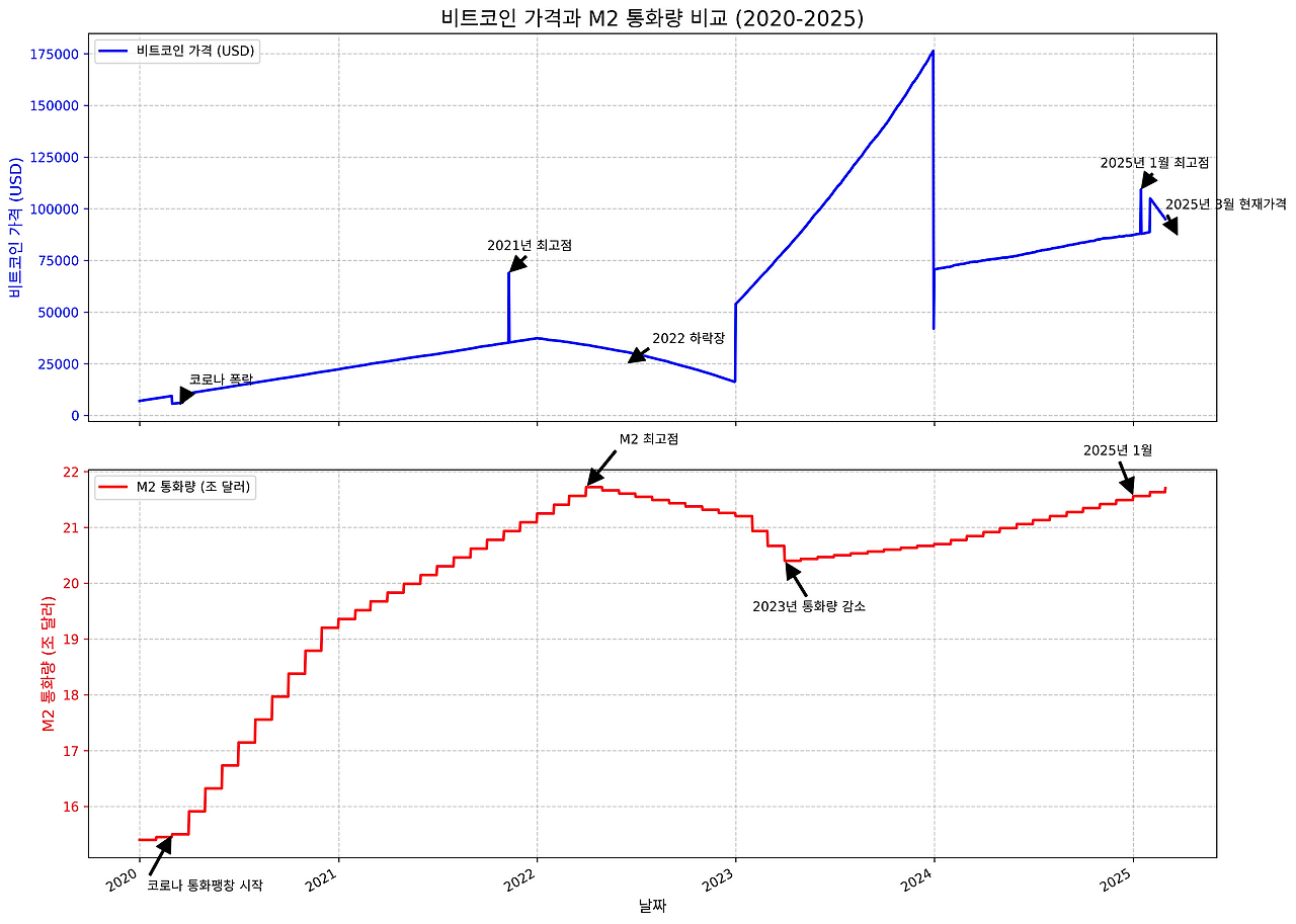 2020년부터 2021년까지는 코로나19 팬데믹으로 인해 미국 연준이 대규모 양적 완화를 실시했던 시기입니다. 이때 M2 통화량은 급격히 증가했으며, 동시에 비트코인 가격도 폭발적으로 상승했습니다.